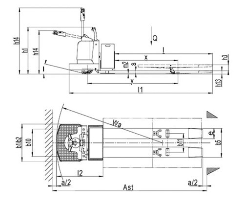 通道寬度,帶1000×1200mm托盤(Ast) |