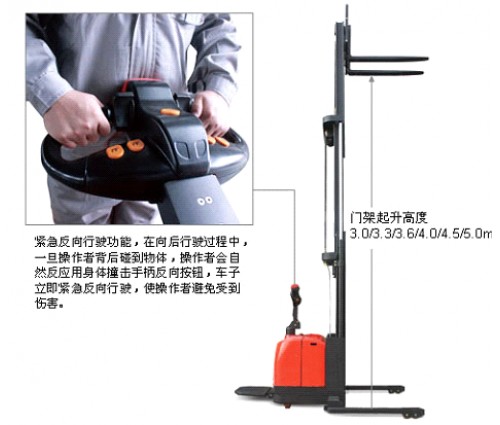 ③ 手柄緊急反向按鈕,有效預防操作人員受到意外傷害;