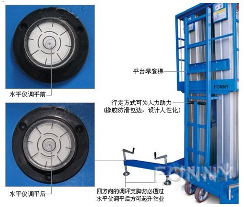 • 平臺控制:平臺上標有操作動作標示圖,易于理解操作。地面也可控制設備的升降 ;