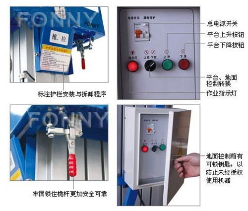 • 緊急下降系統:在斷電或其他故障時,可以啟有緊急下降開關,降下平臺。